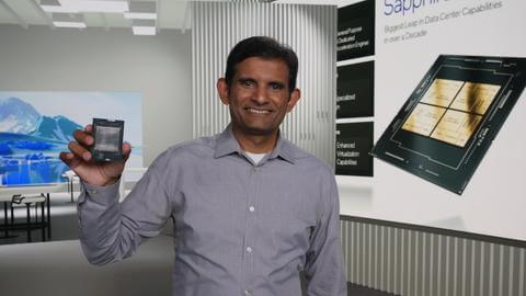 Feature Photo: Sailesh Kottapali, Intel Senior Fellow in the Design Engineering Group and chief architect, holds a Sapphire Rapids chip at the recent Intel Architecture Day. Photo Credit – Intel Corp.