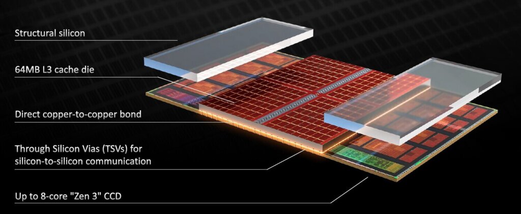 Milan-X with 3D V-Cache employs both hybrid bonding and through-silicon vias (TSVs), reportedly providing 200X the interconnect density of 2D chiplets and 15X the density compared to the existing 3D stacking solutions. The L3 cache to Zen 3 die interface uses direct copper-copper hybrid bonding (reportedly at 9um pitch) and the TSVs connect through the Zen 3 die as shown in Figure 2.