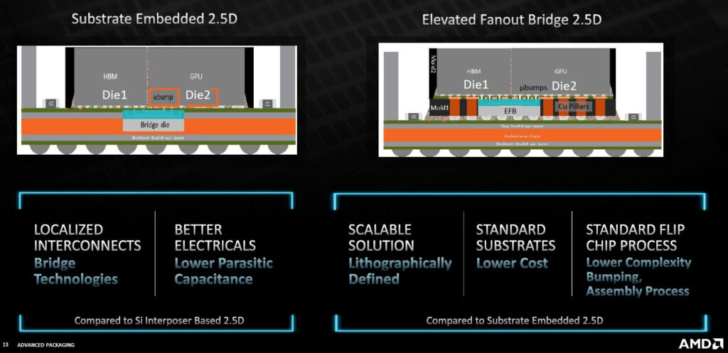 AMD also announced its Elevated Fanout Bridge (EFB) technology (Figure 3). Unlike substrate embedded silicon bridge architectures, EFB reportedly enables the use of standard substrates and assembly techniques, “…providing better precision, scalability, and yields while maintaining high performance.”