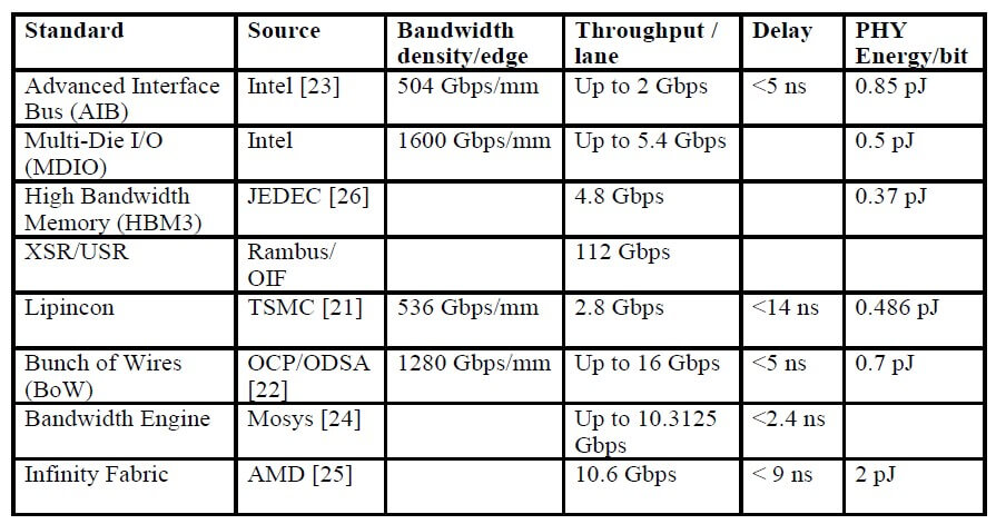 The table shown below compares chiplet communication protocols (references can be found in the original presentation).