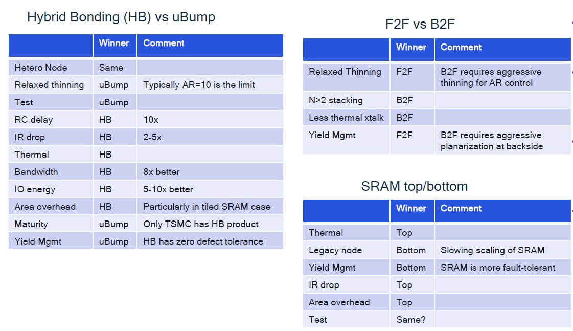 Buried in the presentation was this interesting chart on the pros and cons of various 3D fine-pitch stacking options (Figure 4)