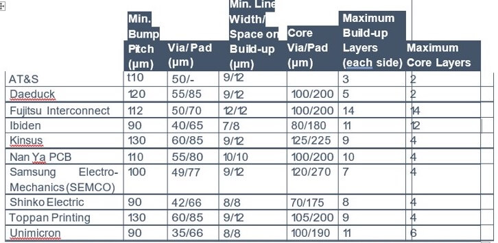 Key global substrate suppliers and their capabilities are shown in Figure 2. Finer features and coreless structures are on these company roadmaps.