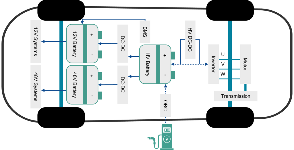 CO2 emission mandates set by various regulatory agencies are driving electromobility growth. For example, as shown in Figure 1, the chart on the left shows normalized CO2 emissions for each of the four major automotive markets, while the chart on the right shows how CO2 emissions can be reduced by various degrees of electrification. The internal combustion engine (ICE) has nearly 100% carbon emissions. In contrast, mild hybrid electric vehicles (MHEV) use a small motor to aid the ICE, providing a 15% emissions reduction. A battery electric vehicle (BEV or EV) uses only a DC battery and motor and thus produces no carbon emissions. Through various powertrain architectures and proliferation, within the next five years, nearly 25% of all vehicles produced will be electrified with the number increasing to around 50% by the end of 2030 [1]. This huge growth is due to increases in expected demand, reductions in the cost of the DC battery, and anticipated growth in the charging infrastructure.