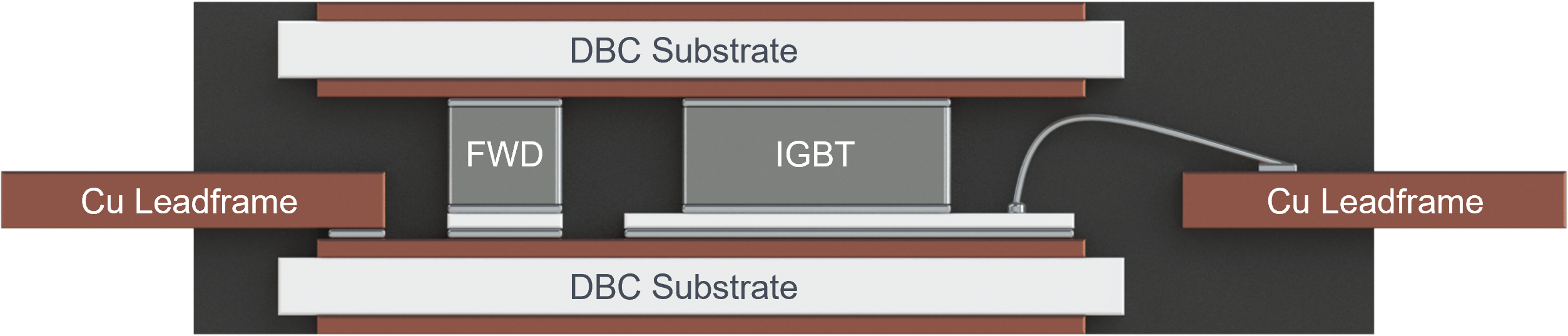 In main inverter applications, power modules must address performance and reliability targets within thermal, electrical, and mechanical constraints. While the bulk of the electrical performance is addressed by the semiconductor devices, power module packaging plays a vital role in meeting the thermal and mechanical targets. However, electrical performance can also be improved by reducing parasitic resistances (R) and stray inductances (Ls) of the package. Ls is especially important to reduce overshoot voltages during switching; Ls of a power module results from the substrate metal parts, wire bonds, and lead frame/bus bars. One of the ways to minimize these losses is to reduce the current loop geometrical length and area. Wire-bond-free concepts such as double-sided soldering and sintering on ceramic substrates are better solutions to lower Ls. One such solution, a double-sided cooling (DSC) molded module, is shown in Figure 3a, where wire bonds are replaced with sintering for the current path between collector and emitter of the insulated gate bipolar transistor (IGBT) switch. The DSC module structure not only reduces the electrical parasitics but also offers enhanced thermal efficiency by removing heat from the top and bottom sides of the package through the substrates.