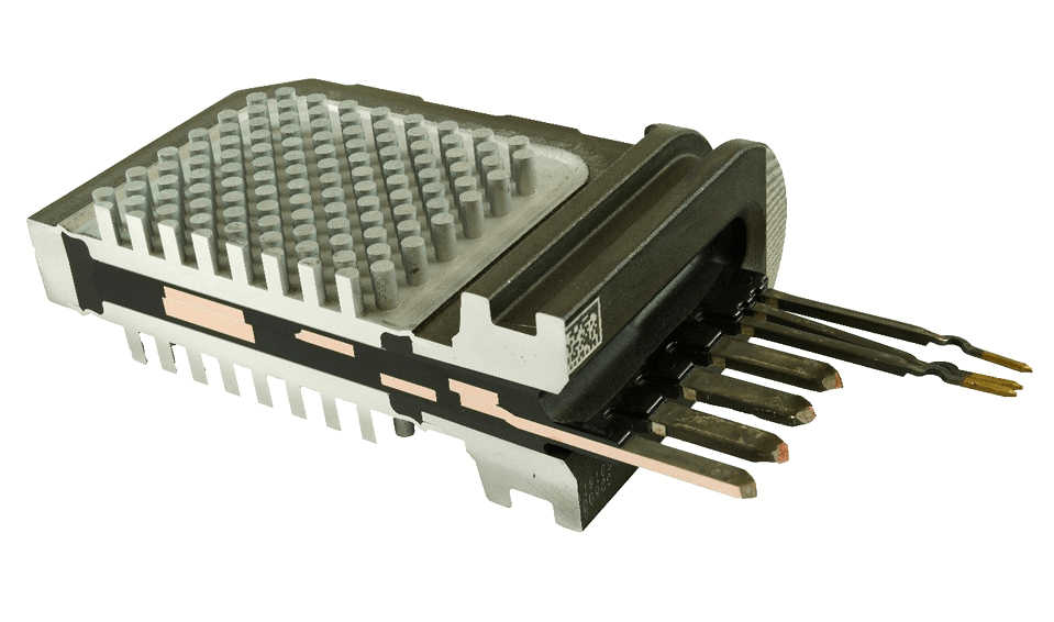 Power cycling and higher ambient temperatures subject power modules to large temperature excursions. So, a cooling system that does not complicate system design and increase cost becomes increasingly important. One way to address these concerns is power module designs with pin-fins (Figure 3b) that share the cooling system used by the motor or engine. For extended reliability, heat must be dissipated effectively, which can only be achieved using low thermal resistance materials. Higher thermal conductivity ceramics such as aluminum nitride (AlN), silicon nitride (Si3N4), and copper (Cu) with a direct cooling structure can be used to reduce the overall thermal resistance. Whether it is a baseplate-free solution such as a DSC module or a pin-fin power module, the packaging industry needs to consider several technologies for next-generation power modules. These include interconnection advancements such as thick gauge (>5 mil) Cu wire, Cu clips, advanced substrates such as Si3N4 with active metal brazing (AMB), die-attach and substrate attach using silver (Ag) or Cu sintering, Cu or AlSiC baseplates, and silicone gel or epoxy resin encapsulation.