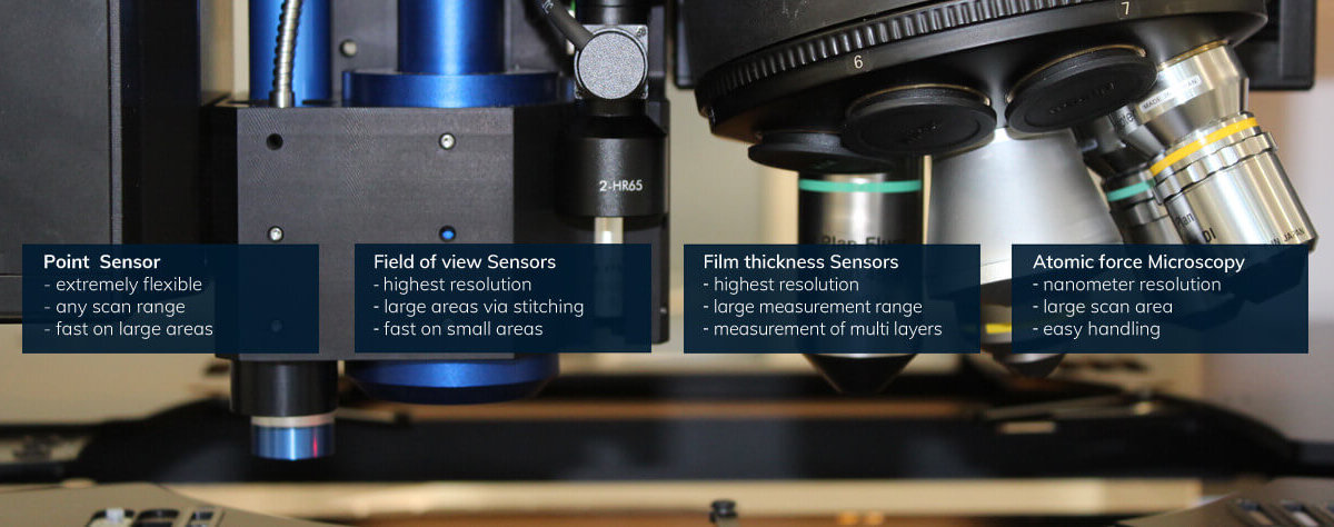 Based on our SurfaceSens concept, the 3D surface metrology measuring devices can be equipped with point, line, and field of view sensors for topography analysis as well as with film thickness sensors. In addition, atomic force microscopy can also be applied. As a result, complex measurement tasks can be solved with the use of different sensors by collecting the data from each sensor and subsequently combining the different results.