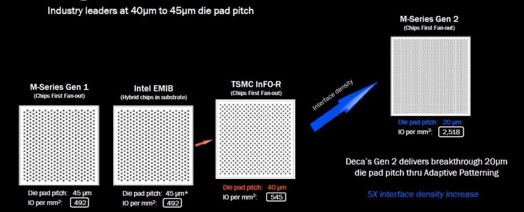 The company claims its Gen 1 technology is currently on par, density-wise, with Intel EMIB technology and TSMC InFO-R (Figure 4). Deca is presently moving to its Gen 2 M-Series technology and claims it will provide a 5X density increase.