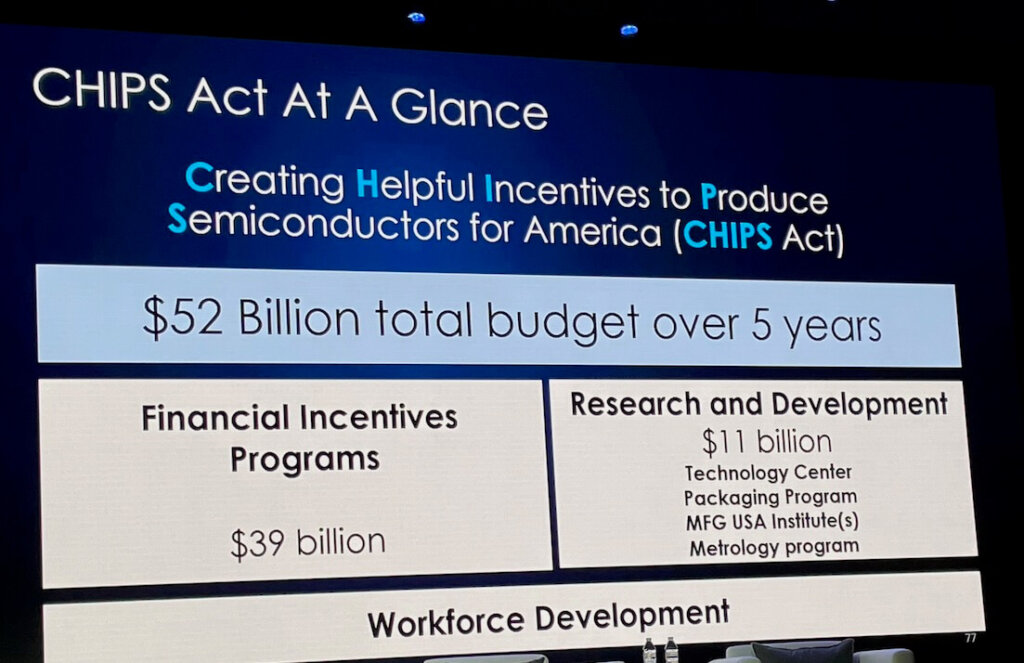 Lori E. Lacassio, Under Secretary for NIST, reported that while the Chips for America Act is still moving (very slowly) through congress, it is moving. While it waits in congress, she says China has invested $15OB in its domestic semiconductor supply chain, the EU has committed $30-50NB in funding, India’s weighing at 30B, Japan is at 6.8B, and South Korea announced plans to build the largest semiconductor supply chain in the world. We need to get the CHIPS Act over the finish line.