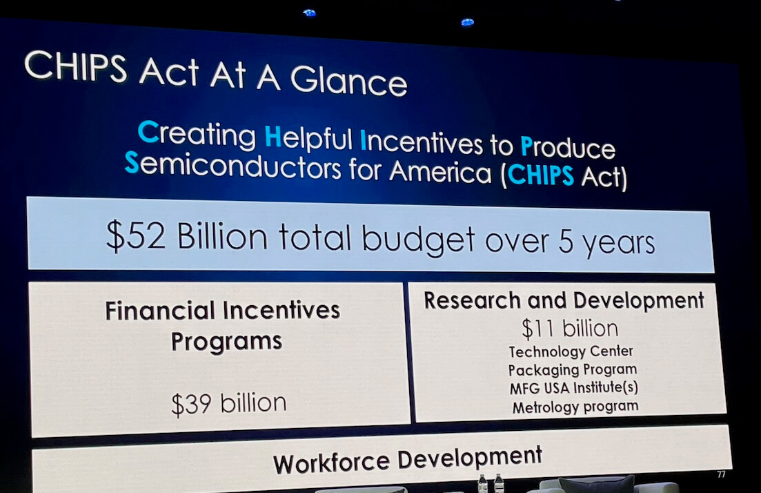 This information was also presented in a keynote by Lori E. Lacassio, Under Secretary for NIST National Institute for Science and Technology, at SEMICON West. She went in a little deeper. First of all, the $52B will be spread over five years. And as I noted in a previous blog post, the allotment for advanced packaging falls under the $11 billion bucket that also includes a technology center, a packaging program, a US manufacturing institute, and a metrology program.