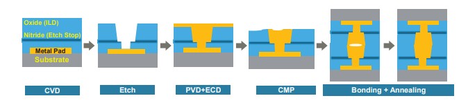 The typical process flow for hybrid bonding is depicted in Figure 1. The metal pad on the last die layer, covered with oxide layers and nitride etch stop, is revealed by etching. Then, the vias are plated through physical vapor deposition (PVD) and electrochemical deposition (ECD) steps. The over-plated Cu is then etched back in a controlled manner using CMP. Finally, the die-to-wafer or wafer-to-wafer hybrid bonding is realized through dielectric bonding followed by annealing.