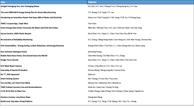Now after kick-off, it’s back to work. Employees will have time to work on proposals as individuals or as teams. The employees will then make a presentation to a committee, which will decide on the winners. Once the winners have been decided upon, they are then given guidance and the opportunity to implement their ideas. The projects are monitored to see how the implementation is going. In 2021 16 ESG “amazing ideas”, were given the opportunity to work on implementation, they are currently being tracked within the TSMC organization. These are listed below.
