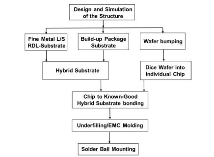 The two chips are supported on the “hybrid substrate”, which is fabricated by combining the thin film RDL-substrate (20mm x 15mm x 53μm) and the build-up package substrate (23mm x 23mm x 1.3mm). The interconnection between the thin film RDL-substrate and the build-up package substrate is through C4 solder joints and underfill (Figure 3).