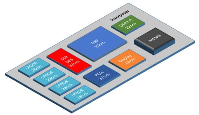 Thus, chiplets are an alternative design methodology to monolithic chips. A single chiplet design would typically have a single function, be operationally dependent on other chiplets, and be reusable across a range of products and product generations. An example is shown in the image above. (Chiplet-based system using an interposer – Source: Cadence)