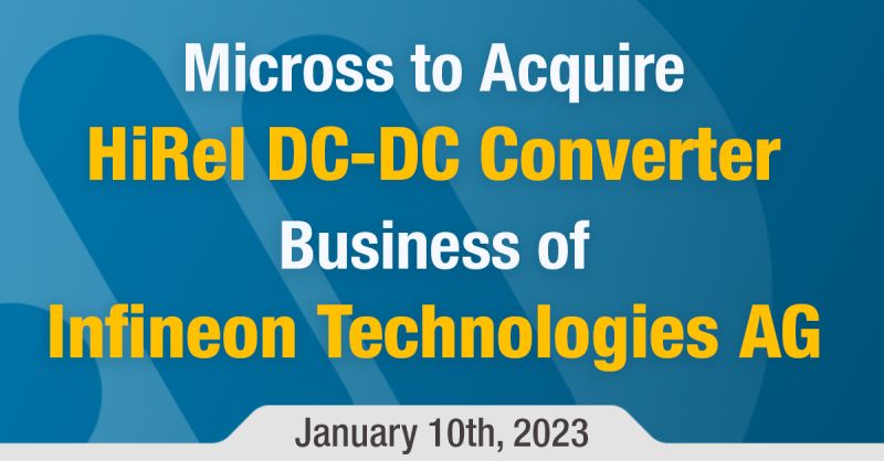 Melville, NY – January 10, 2023 – Micross Components, Inc. (“Micross” or the “Company”), a leading provider of high-reliability microelectronic product and service solutions for aerospace, defense, space, medical and industrial applications and a portfolio company of Behrman Capital, today announced signing a definitive agreement to purchase the High-Reliability DC-DC converter business (the “Business”) of Infineon Technologies AG (FSE: IFX / OTCQX: IFNNY), a global semiconductor leader in power systems and IoT. The deal is expected to close in the first quarter of calendar year 2023.