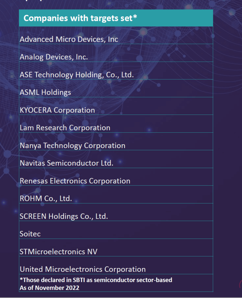 JSR started out by showing how many companies worldwide have made commitments to reaching science-based targets. Multiple companies in the semiconductor ecosystem have set targets and are working to get approval or have achieved approval.