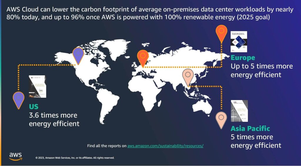 Using the custom silicon, Amazon claims it can reduce the on-premise footprint of data centers. The impact depends on location and AWS getting to 100% renewable power in 2025, as shown in Figure 1.