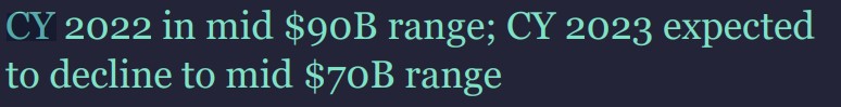 2) And what takes place in the industrial and automotive space. In the current economic environment, it appears companies are starting to look at how to conserve cash. This may mean that industrial plant expansions may slow for 2023, and resume later in 2024 as the economy improves. There is also the question of automotive if TSMC is correct and we are nearing the end of that shortage, will that also cause a slowing in production, especially if due to the economy new car sales begin to slow down?