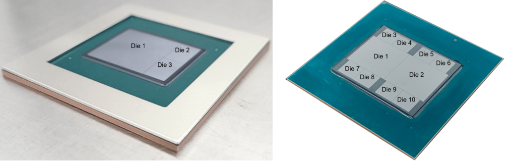 Presently, there are two internal TVs for S-Connect development. Development and internal qualification have been completed on three die modules comprising a larger die and two smaller (like high bandwidth memory (HBM)) die. The module has two bridge die and several test dies to mimic the placement of non-TSV bearing IPD die. On a larger scale, module TV development is occurring with 10 top die and 10 bridge die. This demonstration targets the very large modules, which benefit most from the use of silicon bridge die. Reliability results are expected on this TV in 2023. Figure 4 shows the two S-Connect test vehicles.