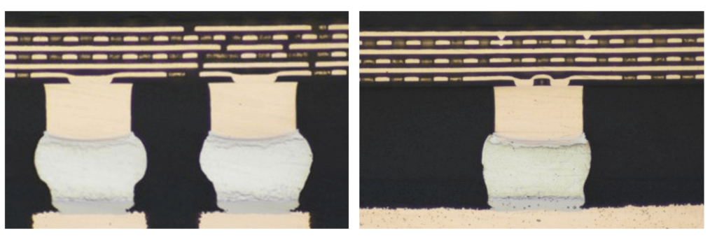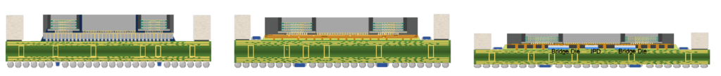 The industry has been working on methods that utilize bridging technologies for several years. Intel’s embedded multi-die interconnect bridge (EMIB) utilizes a bridge placed within the organic substrate to allow high-density routing without the use of silicon interposers. Amkor’s approach to this space embeds a bridge (silicon or other) into an HDFO design and this brings ultra-high-density design rules to the HDFO toolbox. Amkor refers to this technology as S-Connect. Figure 3 shows a comparison of these two design techniques.
