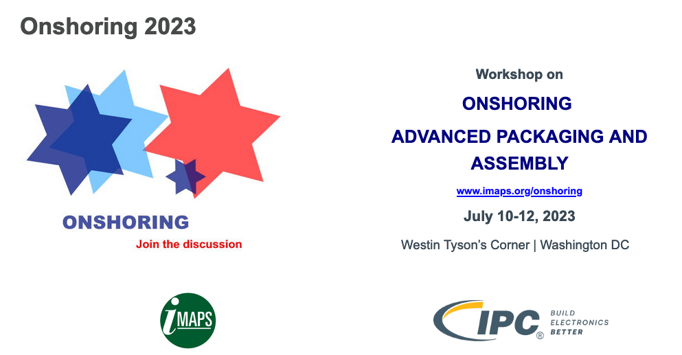 The International Microelectronics Assembly and Packaging Society (IMAPS) and IPC will host a Workshop to discuss and promote strategies to improve On-Shoring Advanced Packaging and Assembly, July 10-12, 2023, in Washington, DC. This workshop will bring Government agencies, the DIB (Defense Industrial Base) and Advanced Packaging and Assembly providers together to discuss their efforts to onshore advanced packaging. The mission of this event is to engage our workforce community to identify the newly created Advanced Packaging programs which address US Government and Defense requirements critical to the onshoring of the microelectronic assembly and packaging supply chain. Government agencies including the Department of Commerce/NIST, DoD (SHIP/IBAS/Title III/Printed Circuit Board Executive Agent), DARPA and SRC will be briefing on their advanced packaging programs.