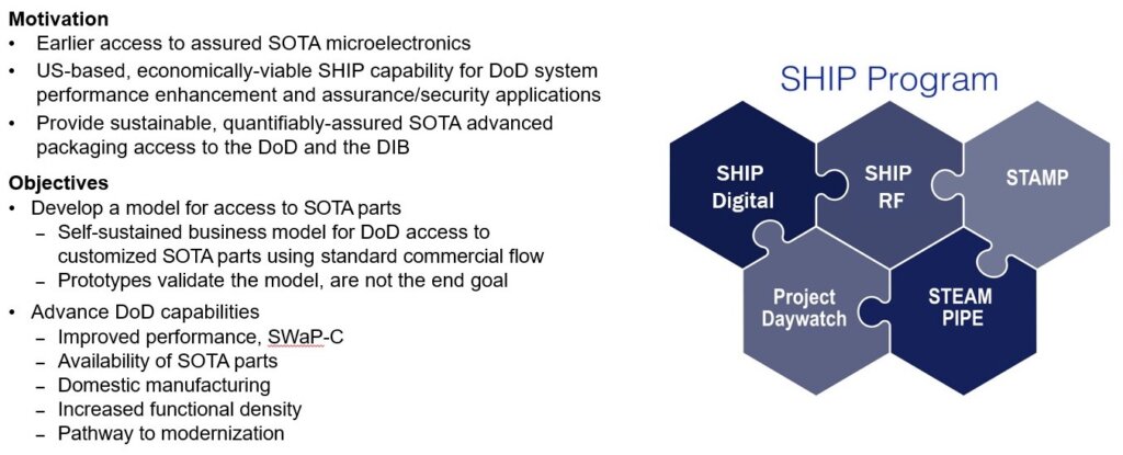 Brian Olson, SHIP RF Technical Manager for Advanced Packaging and Test Technical Execution Area in the Office of the Under Secretary of Defense for Research & Engineering updated the audience on the State-of-the-art Heterogeneous Integrated Packaging program [SHIP]. The SHIP program is described in Figure 2.