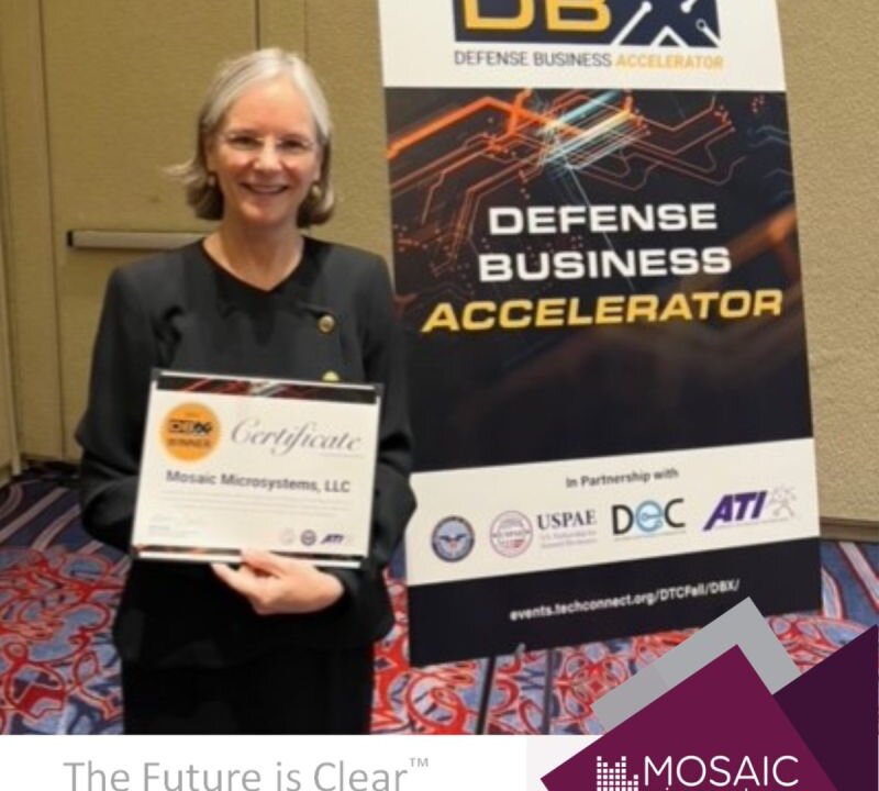 “We are pleased to have been selected for this prestigious award,” says Christine Whitman, CEO of Mosaic Microsystems. “The Defense Business Accelerator recognition validates our business strategy for expansion and underscores the critical role of Mosaic’s glass technology.”