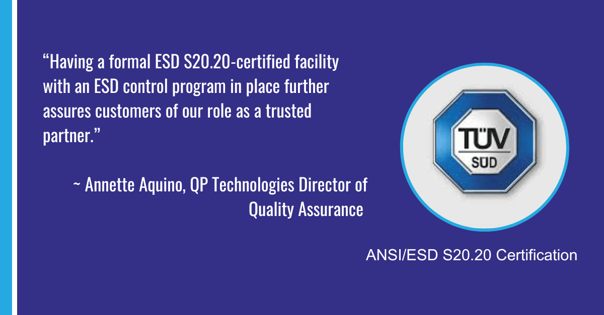 “Multiple customers, particularly larger companies, have increasingly requested that we become ESD certified. While we have taken steps to minimize ESD damage for many years, as a result of this latest audit, we have added and are regularly performing additional testing and monitoring processes to qualify all of the equipment and materials we use throughout our manufacturing line,” said Annette Aquino, QP Technologies Director of Quality Assurance. “Having a formal ESD S20.20-certified facility with an ESD control program in place further assures customers of our role as a trusted partner.”