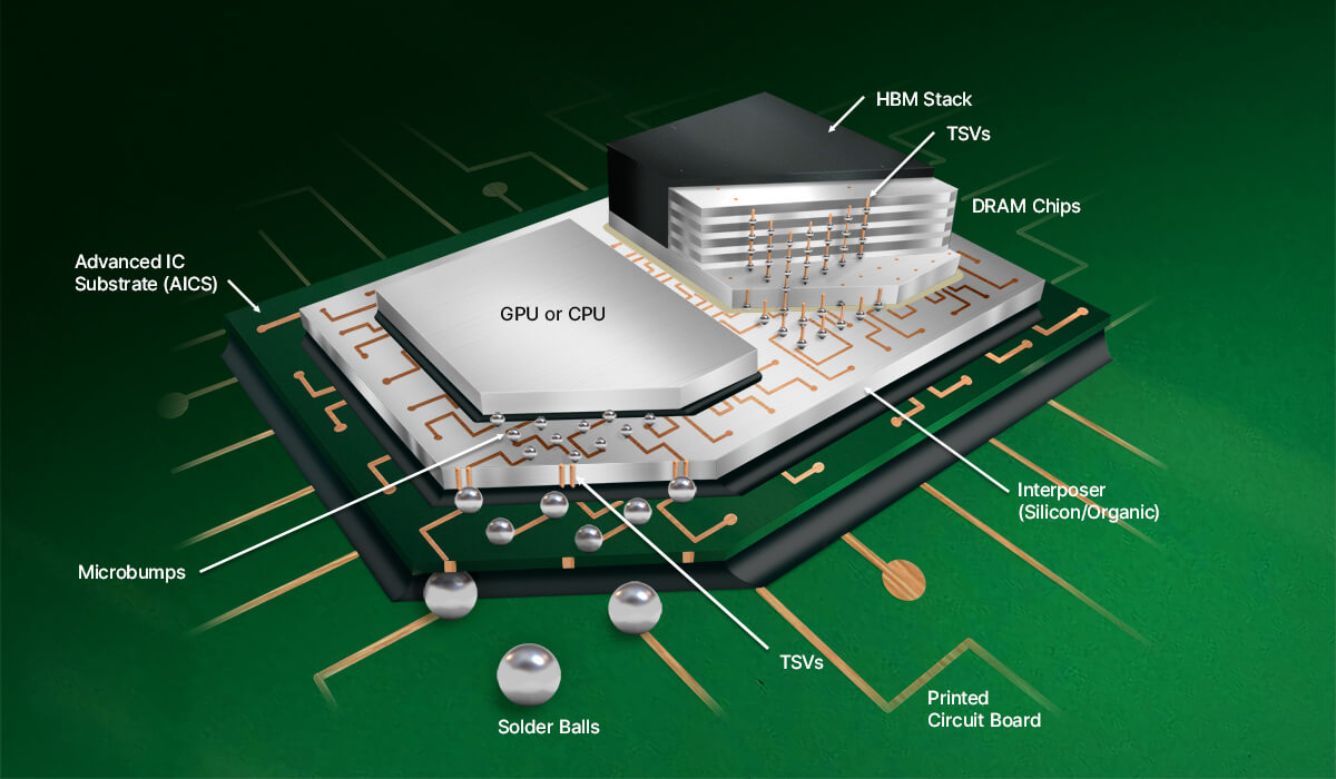 A graphic processing unit (GPU) and multiple 3D high-bandwidth memory (HBM) stacks provide the major pieces in the AI puzzle. These puzzle pieces are first assembled on top of a silicon interposer. An advanced IC substrate (AICS) provides the foundation on which the 2.5D package is built.