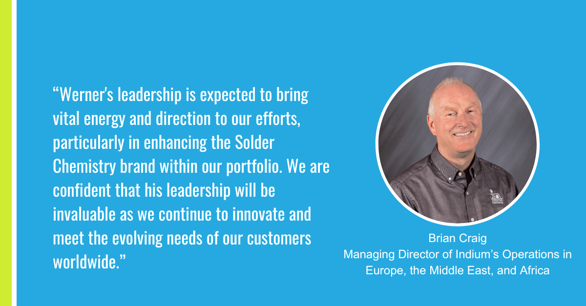 “We are excited to welcome Werner Wagner to our team,” said Brian Craig, Managing Director of Indium’s Operations in Europe, the Middle East, and Africa. “His appointment comes at a crucial time as we look to redefine our market position and drive forward our strategic goals. Werner’s leadership is expected to bring vital energy and direction to our efforts, particularly in enhancing the Solder Chemistry brand within our portfolio. We are confident that his leadership will be invaluable as we continue to innovate and meet the evolving needs of our customers worldwide.”