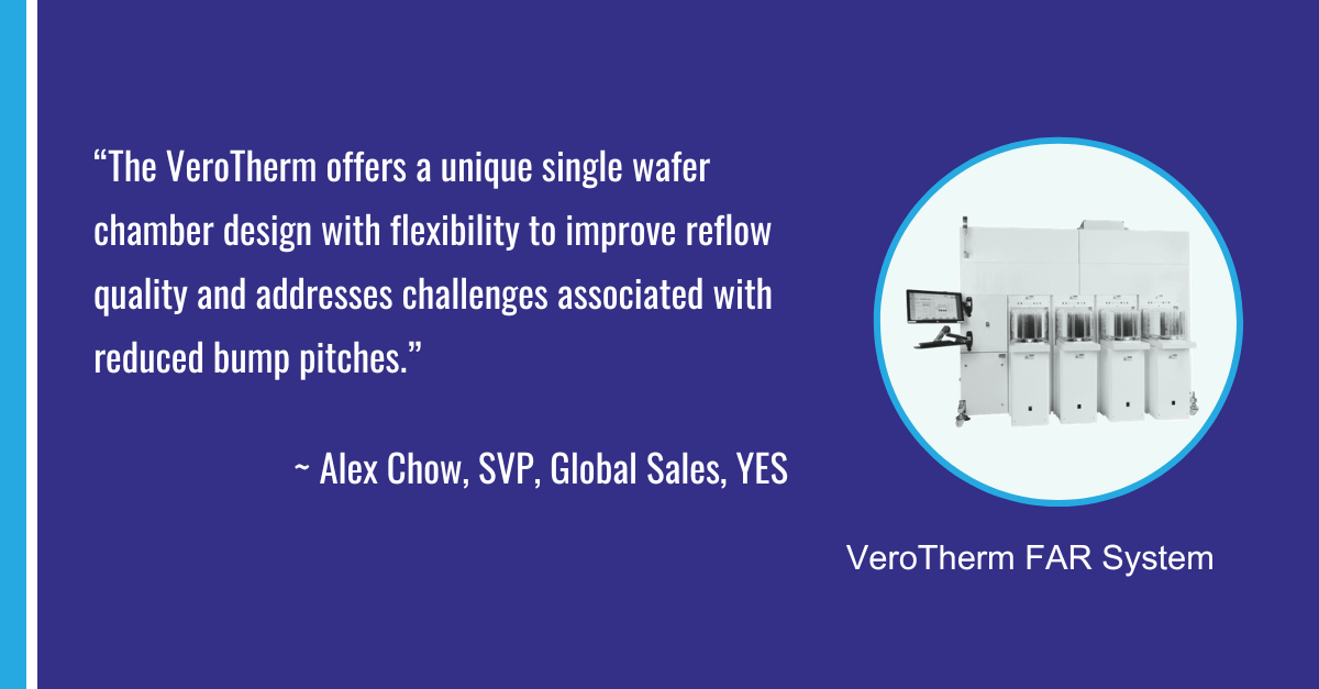 “The VeroTherm offers a unique single wafer chamber design with flexibility to improve reflow quality and addresses challenges associated with reduced bump pitches. YES has demonstrated superior reflow results with no bump cracking defects observed at sub-30 micron pitch and no collapsed bumps with pitches down to 12µm. The YES proprietary process also results in defect-free solder reflow resulting in high throughput and low CoO. These results can extend bump-based mass reflow technology to sub-10um pitch” said Alex Chow, SVP Global Sales at YES. “These orders are an important milestone for YES as it is a validation of our efforts to serve the multiple market segments.”