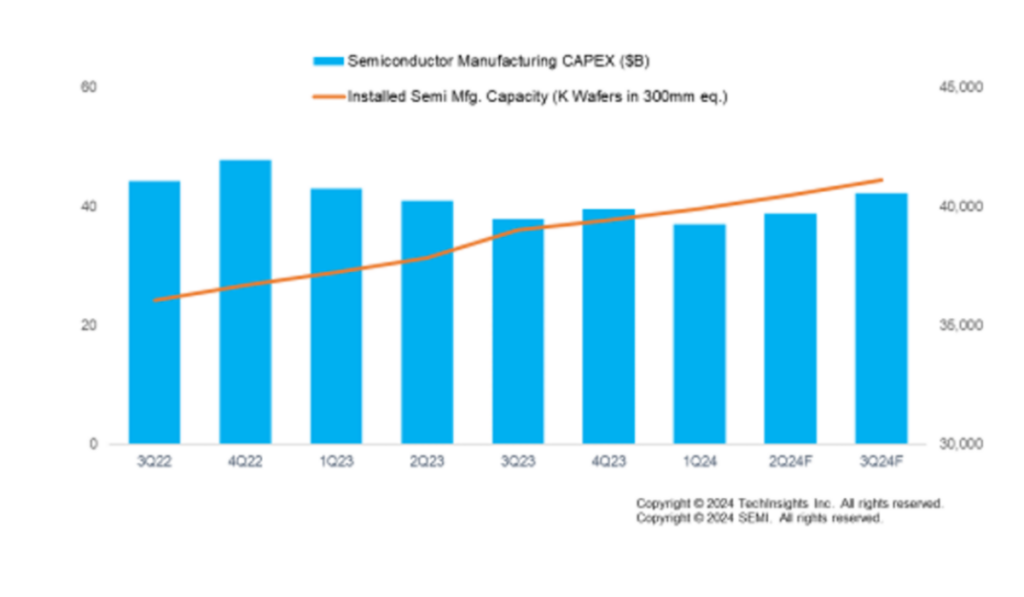 The global semiconductor manufacturing industry in the second quarter of 2024 continued to show signs of improvement with significant growth of IC sales, stabilizing capital expenditure, and an increase in installed wafer fab capacity, SEMI announced today in its Q2 2024 publication of the Semiconductor Manufacturing Monitor (SMM) Report, prepared in partnership with TechInsights. While slower recovery in some end markets impacted the pace of growth in the first half of the year, the surge in demand for AI chips and high bandwidth memory (HBM) created strong tailwinds driving industry expansion.