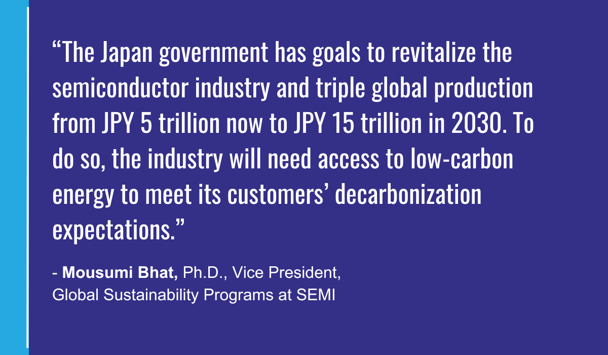 “The Japan government has goals to revitalize the semiconductor industry and triple global production from JPY 5 trillion now to JPY 15 trillion in 2030,” said Mousumi Bhat, Ph.D., Vice President, Global Sustainability Programs. “To do so, the industry will need access to LCE to meet its customers’ decarbonization expectations.”