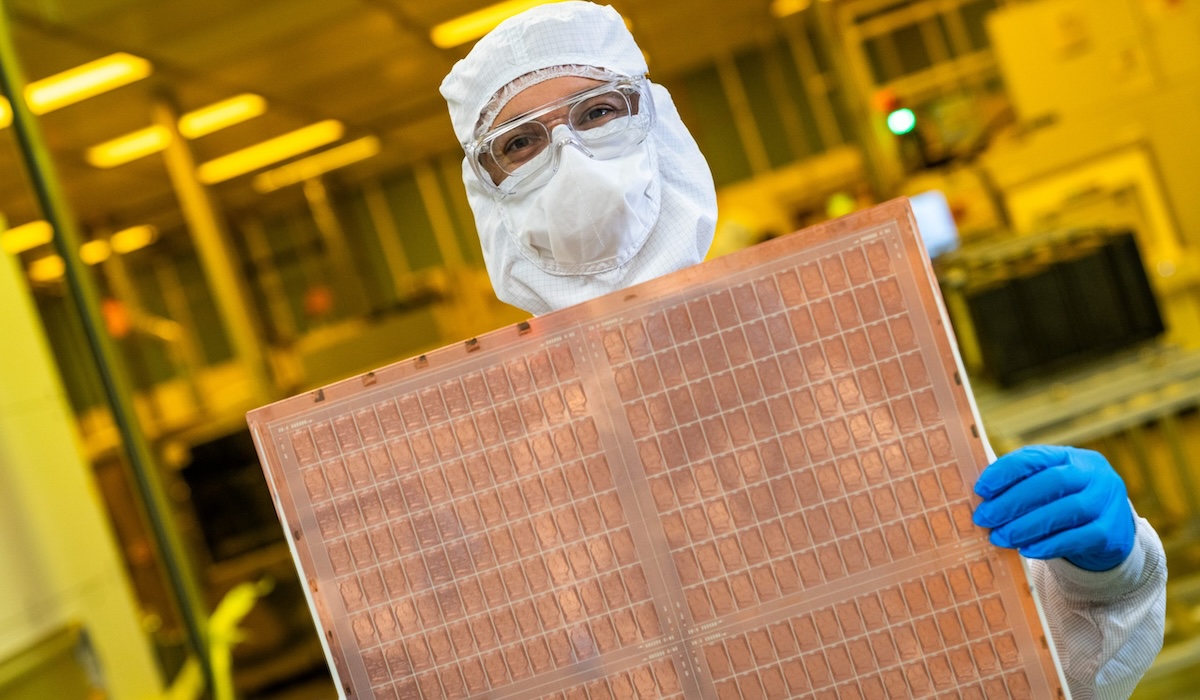 An Intel engineer holds a test glass core substrate panel at Intel’s Assembly and Test Technology Development factories in Chandler, Arizona, in July 2023. Intel’s advanced packaging technologies come to life at the company’s Assembly and Test Technology Development factories. (Credit: Intel Corporation)