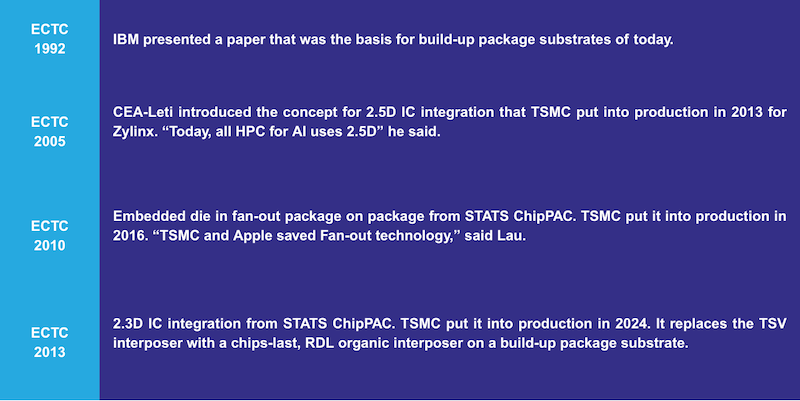 In determining the technologies he would highlight in his talk, John Lau said there were so many to consider, he set up criteria – it had to have made it to high volume manufacturing. He selected four papers that were key innovations:
