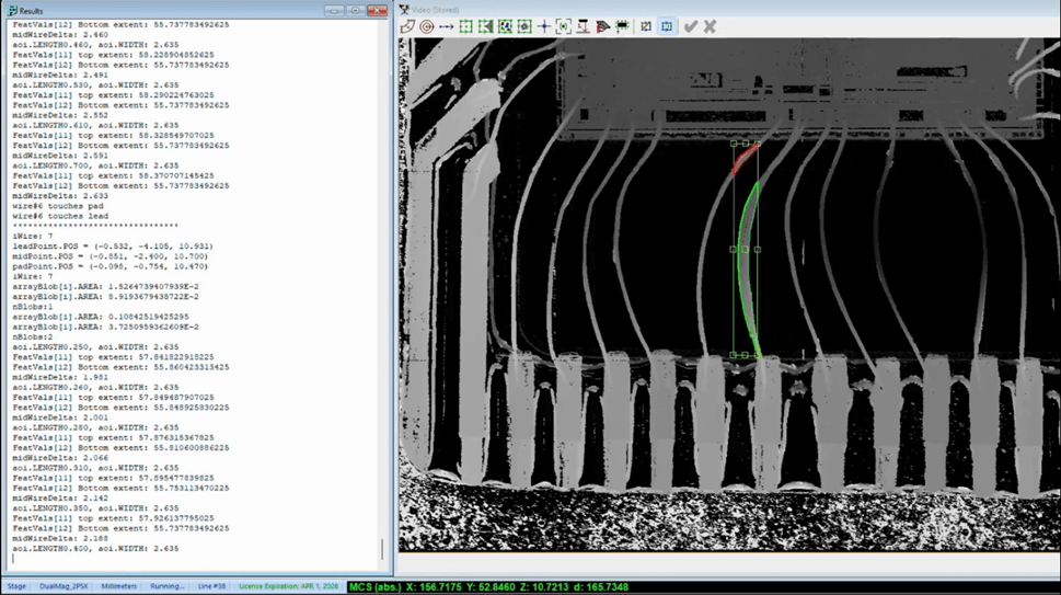 Inspection routines are implemented in a flexible metrology software environment that supports scripting, custom logic, and advanced image processing. Capabilities include optimized edge detection for reflective features, histogram-based thresholding to isolate wires and bond pads, masking and blob analysis for continuity verification, and extraction of dimensional measurements for statistical process control and yield analysis. This flexibility allows routines to be tailored to specific wire bond designs, materials, and manufacturing requirements, supporting both development and high-volume production.
