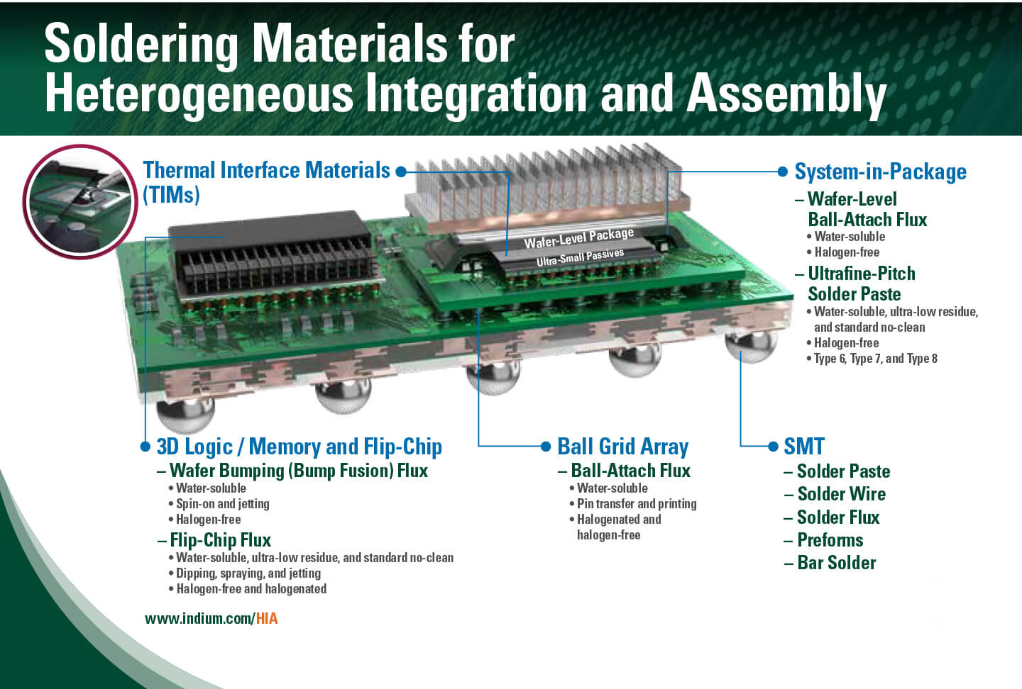 In response to the miniaturization and functional densification of semiconductor packages for SiP and heterogeneous integration, Indium Corporation offers a comprehensive portfolio of solder pastes designed for ultrafine-pitch printing. SiPaste® Solder Paste series is specifically designed for fine feature printing with fine powders ranging from Type 6 to Type 8. They help customers Avoid the Void®, reduce slumps, and demonstrate consistent superior printing performance. Among its offerings, award-winning SiPaste® C201HF is specifically formulated to accommodate fine feature printing, combining superior non-wet open performance with excellent stencil print transfer efficiency to satisfy the broadest range of process requirements and boost SPI yields. Additionally, SiPaste® 3.2HF has been used by leading OSATs for more than 5 billion mobile SiP modules.