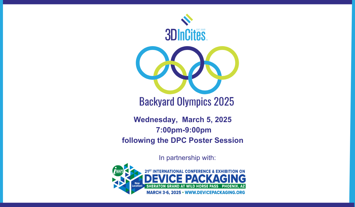The inaugural 3D InCites Back Yard Olympics was such a hit, we’re doing it again! This is your opportunity to mix and mingle with members of 3D InCites and IMAPS communities and show off your hidden talents. Do you rock the hula hoop? Are you a cornhole champion? Proficient at putting? Skilled with an axe? Put a team together, pose for your team photo, and get your game on.