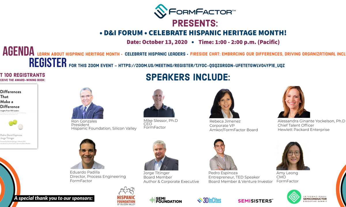 To celebrate Hispanic Heritage month, FormFactor has assembled an esteemed group of leaders from our industry and community to share their insights on “Embracing Our Differences, Driving Organizational Inclusion”. This Zoom meeting forum will be held online on Tuesday, October 13th from 1-2 PM (PDT). Find out more about Hispanic Heritage Month and join us to learn from these leaders.