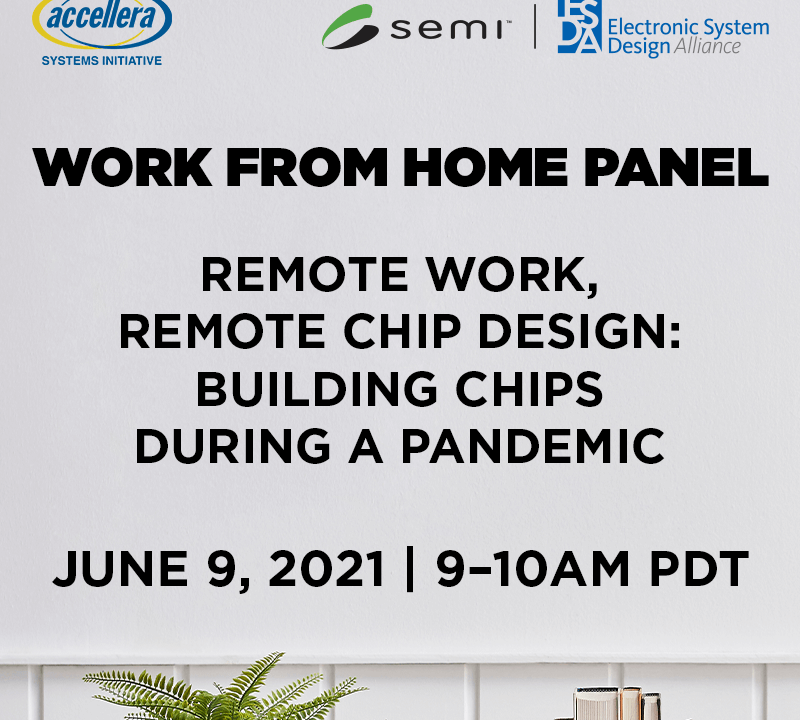 A panel co-sponsored with Accellera titled “Remote Work, Remote Chip Design: Building Chips in a Pandemic” will explore chip design and verification project upheaval caused by the pandemic. It will be held Wednesday, June 9, from 9-10am PDT. (See attached hero image.)