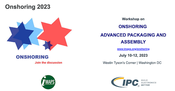 Overview: The International Microelectronics Assembly and Packaging Society (IMAPS) and IPC will host a three-day Workshop to discuss and promote strategies to improve On-Shoring Advanced Packaging and Assembly, July 10-12, 2023, at the Westin Tyson’s Corner just outside Washington DC. This workshop will be bringing Government agencies, the DIB (Defense Industrial Base), and Advanced Packaging and Assembly providers together to discuss their efforts to onshore advanced packaging. The mission of this workshop is to engage our workforce community to identify the newly created Advanced Packaging programs which address US Government and Defense requirements critical to the onshoring of the microelectronic assembly and packaging supply chain. Government agencies including the Department of Commerce/NIST, DoD (SHIP/IBAS/Title III/Printed Circuit Board Executive Agent), DARPA and SRC will be briefing on their advanced packaging programs.